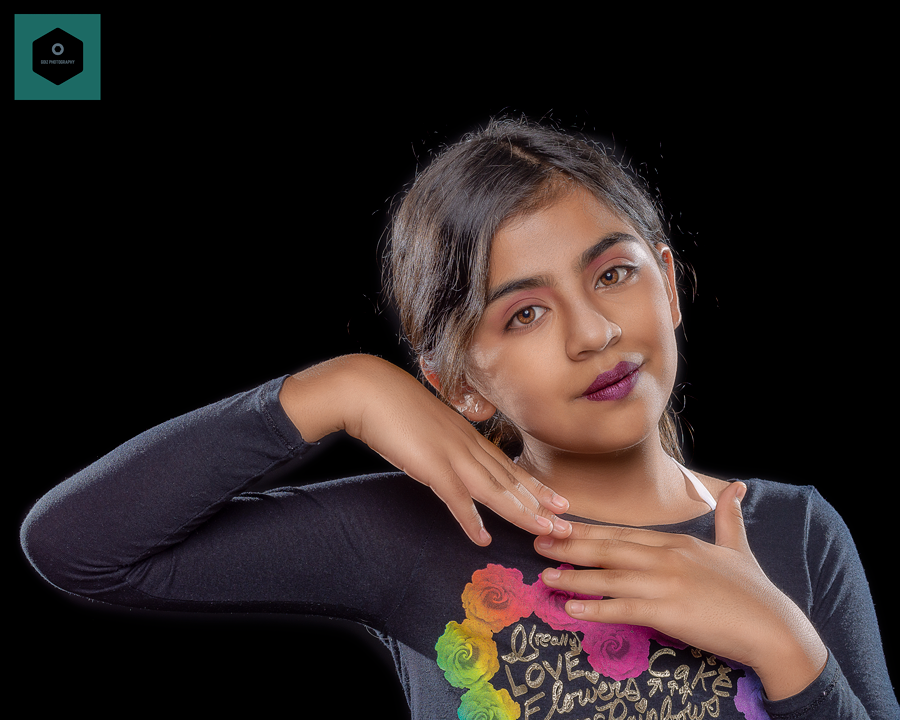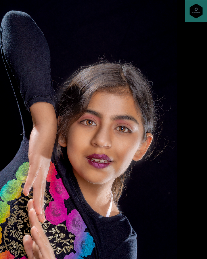 En el ejemplo arriba, se utilizaron dos luces de separación, una a cada lado y detrás de la modelo. Se pueden observar los contornos en el cabello y las manos. Ese es el efecto que produce una luz de separación o rim light. De no haberse utilizado, el resultado final nos daría un cabello que se pierde en el fondo negro, o cabello fantasma, como se le conoce en fotografía de retrato.